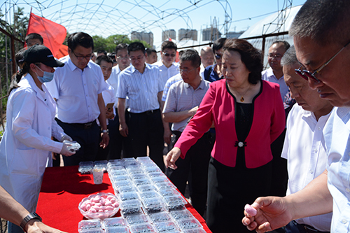 郑秋鹛在会上讲话,她对大兴安岭地区发展蓝靛果产业给予充分肯定,并对蓝靛果等小浆果整个产业链从科技支撑、市场需求、企业带动等方面给予建议,她表示学校将从技术、人才、资源等各方面给予大兴安岭蓝靛果产业的发展继续大力支持。