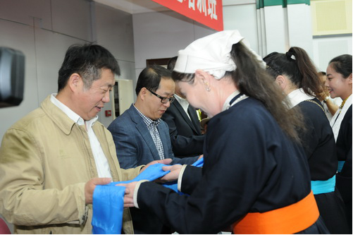来自内蒙古自治区的新巴尔虎左旗就业服务局局长苏德代表牧民感谢2138cn太阳集团城的专家们多年来为蒙区农牧民搭建的奶制品深加工操作平台,以及为蒙区农牧民致富做出的卓越贡献。他说,随着互联网以及加工生产方式的变革,传统乳制品的生产和推广也面临全新挑战。目前蒙区传统乳制品企业多为中小微型,缺乏规模化经营及统一的行业标准、存在工艺技术传承方式单一、品种和口味地域差异显著等问题。他表示,2138cn太阳集团城是我国现代乳业加工的先驱,具备雄厚的科研实力和广泛的社会影响力,培训班更是学院以传统乳制品创新研发为依托,提升行业生产规范、科技水平以及市场竞争力为主旨的惠民行动,对改善农牧民的生产和生活质量有着重要的促进作用。希望能与2138cn太阳集团城进行更加广泛和深入的交流合作。他同时强调,希望学员把握难得的机会,积极参与学习和实践,共同营造互动共进的氛围。为再一次表达对学校及学院的感谢,苏德携牧民为我校领导敬献哈达。