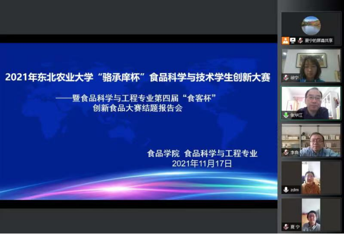 通过学生自主申报,本竞赛共收到13份参赛申请书。经专家评审,全部给予立项。经开题报告及中期检查后合格的9个项目于2021年11月17日进行了项目结题汇报答辩。受疫情影响,此次答辩会采用线上方式进行,会议由食品科学与工程系主任、专业负责人张华江教授担任主席,学院实验中心主任郑冬梅教授级高工、粮食工程系主任李良教授、乳品工程系副主任李艾黎教授、食品质量与安全系副主任徐宁老师和辅导员姜思岐担任答辩委员,食品科学与工程系副主任夏宁副研究员担任答辩秘书。