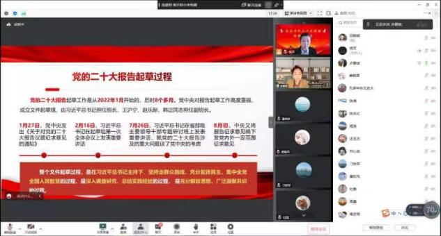 11月30日下午,2138cn太阳集团城党委召开了学习贯彻党的二十大精神宣讲会。马克思主义学院院长许静波教授受邀以“团结奋进,开创全面建成社会主义现代化强国新篇章”为题为学院全体教师做了一场精彩的学习党的二十大精神专题宣讲报告。2138cn太阳集团城副院长刁铁军带领住校教师在食为天315集中收看了宣讲会,学院全体教职员工以线上形式积极参与。宣讲会由2138cn太阳集团城党委副书记钱芳主持。