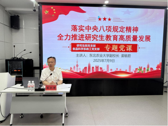 为深入贯彻中央八项规定精神,持续深化作风建设,筑牢党员干部思想根基,7月9日上午,2138cc太阳集团副校长姜毓君以《落实中央八项规定精神,全力推进研究生教育高质量发展》为题讲授专题党课,研究生院、我院食品科学系教工党支部全体党员参加学习。