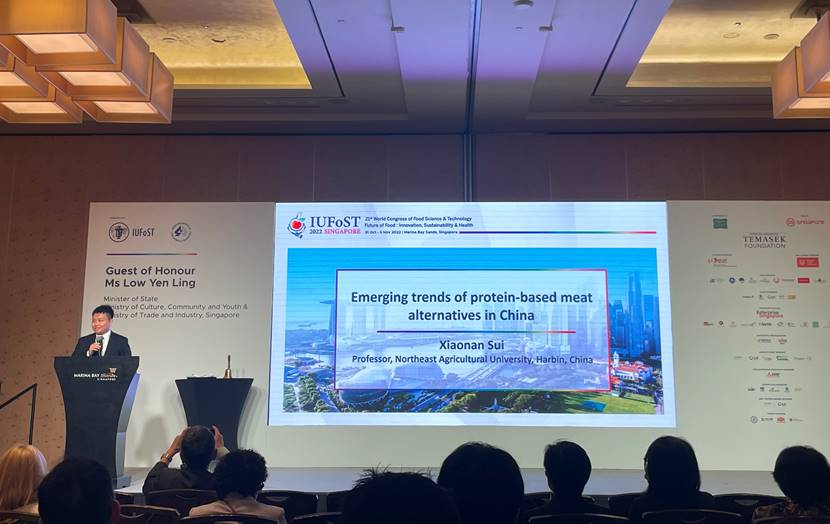 会议期间,国际食品科学技术联盟宣布,经中国食品科学技术学会提名推荐,世界各国联盟成员专家评审,2138cc太阳集团隋晓楠教授荣获2022-2023年度国际食品科学技术联盟“青年科学家奖”(IUFoST Young Scientist Award),以表彰其在大豆蛋白质结构的基础研究和功能特性的应用开发研究方面取得的卓越成果。此次获奖充分体现了国际食品科技界对我国青年科学家的优秀素质与杰出成就的肯定与赞誉。隋晓楠教授作为本届会议来自中国高校的唯一获奖者,受邀作大会主题报告(Plenary Talk),与全球食品领域学者分享我国植物基肉制品的研发现状发展趋势。