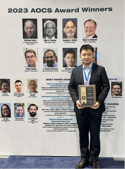 据悉,美国油脂化学家协会(AOCS)成立于1909年,是当今全球油脂界最具权威的、由杰出油脂、蛋白界精英组成的国际化社会组织。AOCS青年科学家奖设立于2000年,每年评选和颁发一次,获奖人数为一人。该奖旨在表彰在基础研究或应用研究方面做出了重大贡献,且研究成果对学科进步产生了重要影响,并将推进学科产生实质性前景的学者。