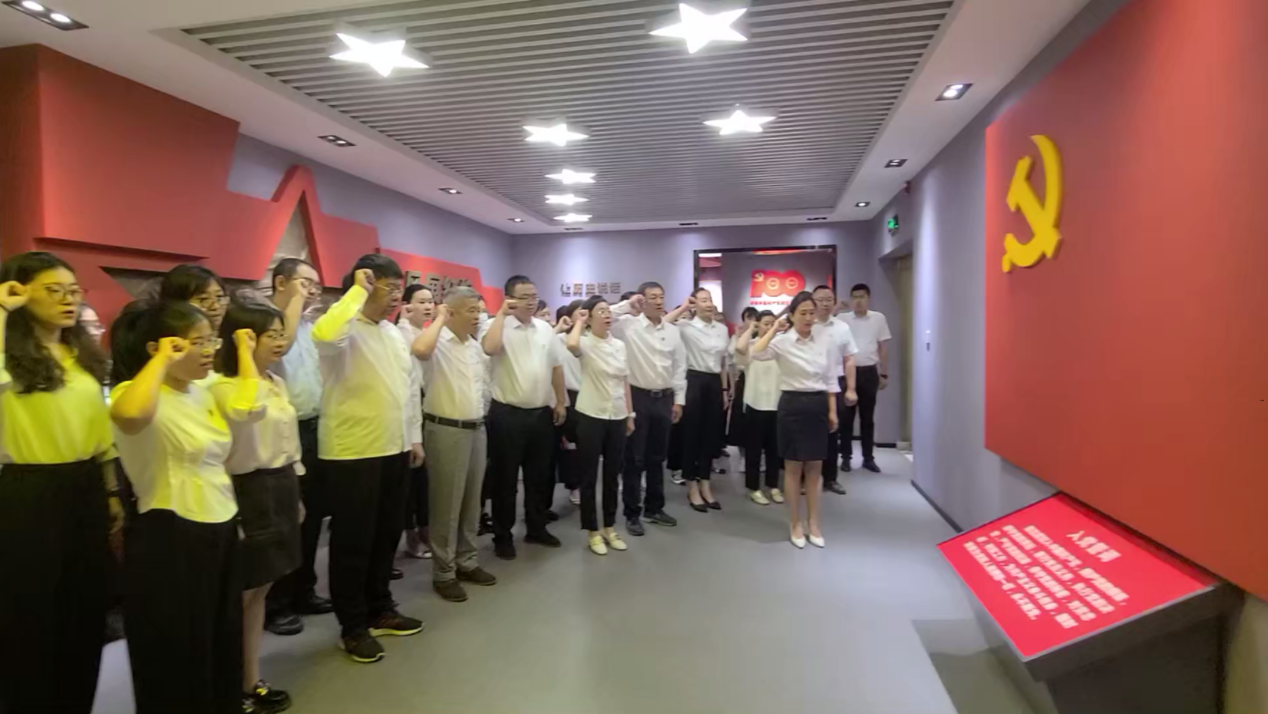 参观结束后,全体参观人员面对鲜红的党旗,庄严地举起右拳,在党委副书记钱芳的带领下,重温入党誓词,郑重宣誓。