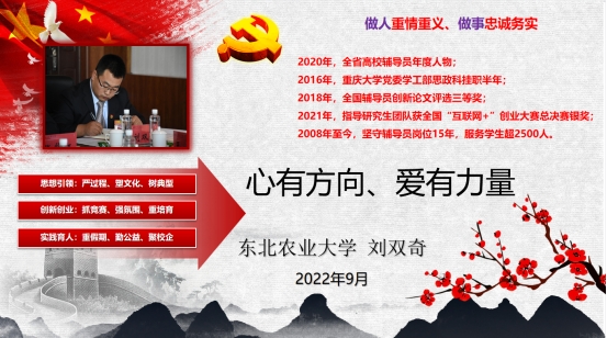 近日,由黑龙江省教育厅组织开展的2022年“龙江最美高校辅导员”推选展示活动落下帷幕。经资格审核、通讯评审、述职答辩三个环节,推选出2022年“龙江最美高校辅导员”10人,“龙江最美高校辅导员”入围奖30人。我院副处级辅导员刘双奇荣获2022年“龙江最美高校辅导员”荣誉称号,并将代表黑龙江省参加2022年全国“最美高校辅导员”推选展示活动。