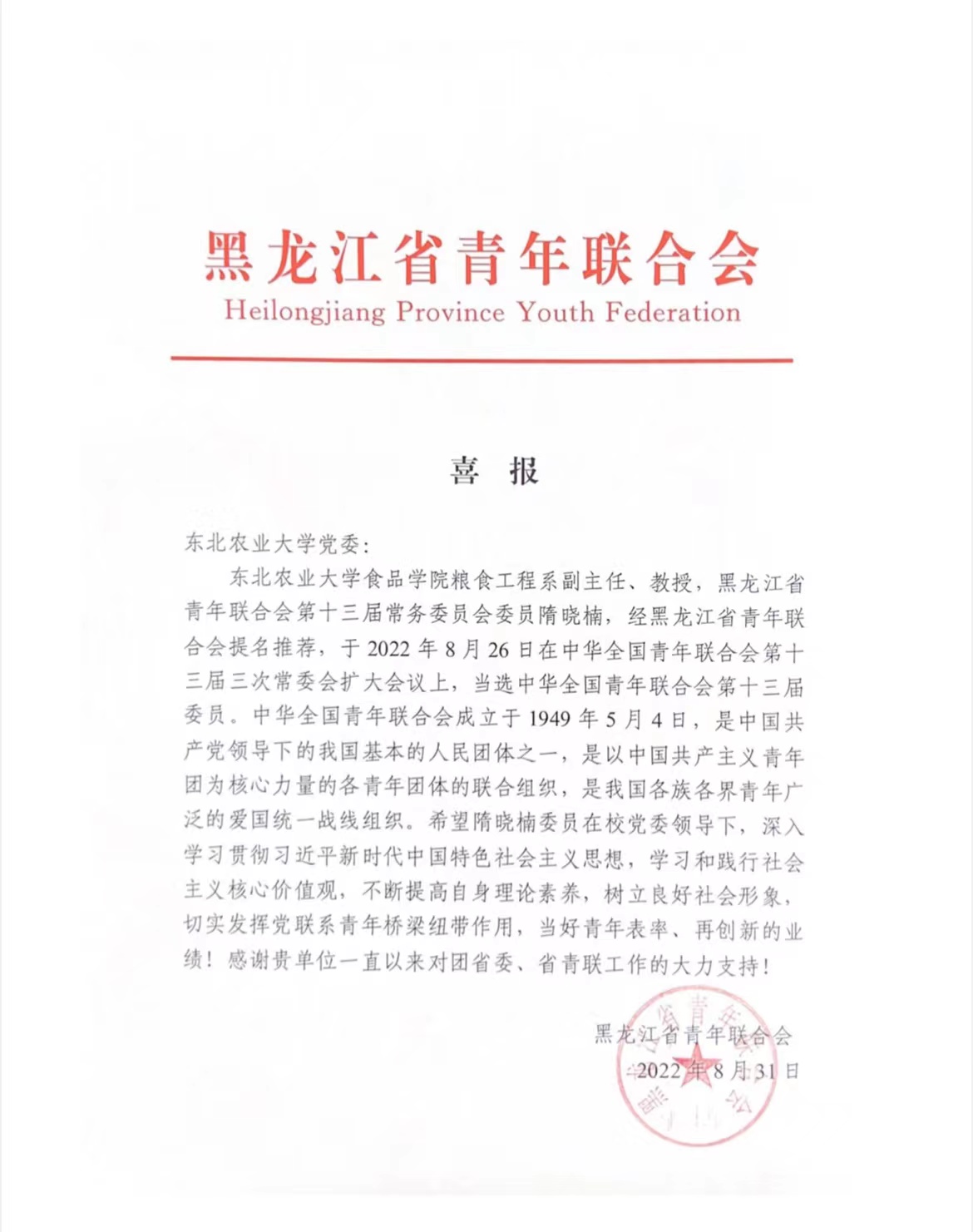 8月26日在中华全国青年联合会第十三届三次常委会扩大会议上,我院粮食工程系副主任、教授、黑龙江省青年联合会第十三届常务委员会委员隋晓楠,当选中华全国青年联合会第十三届委员。