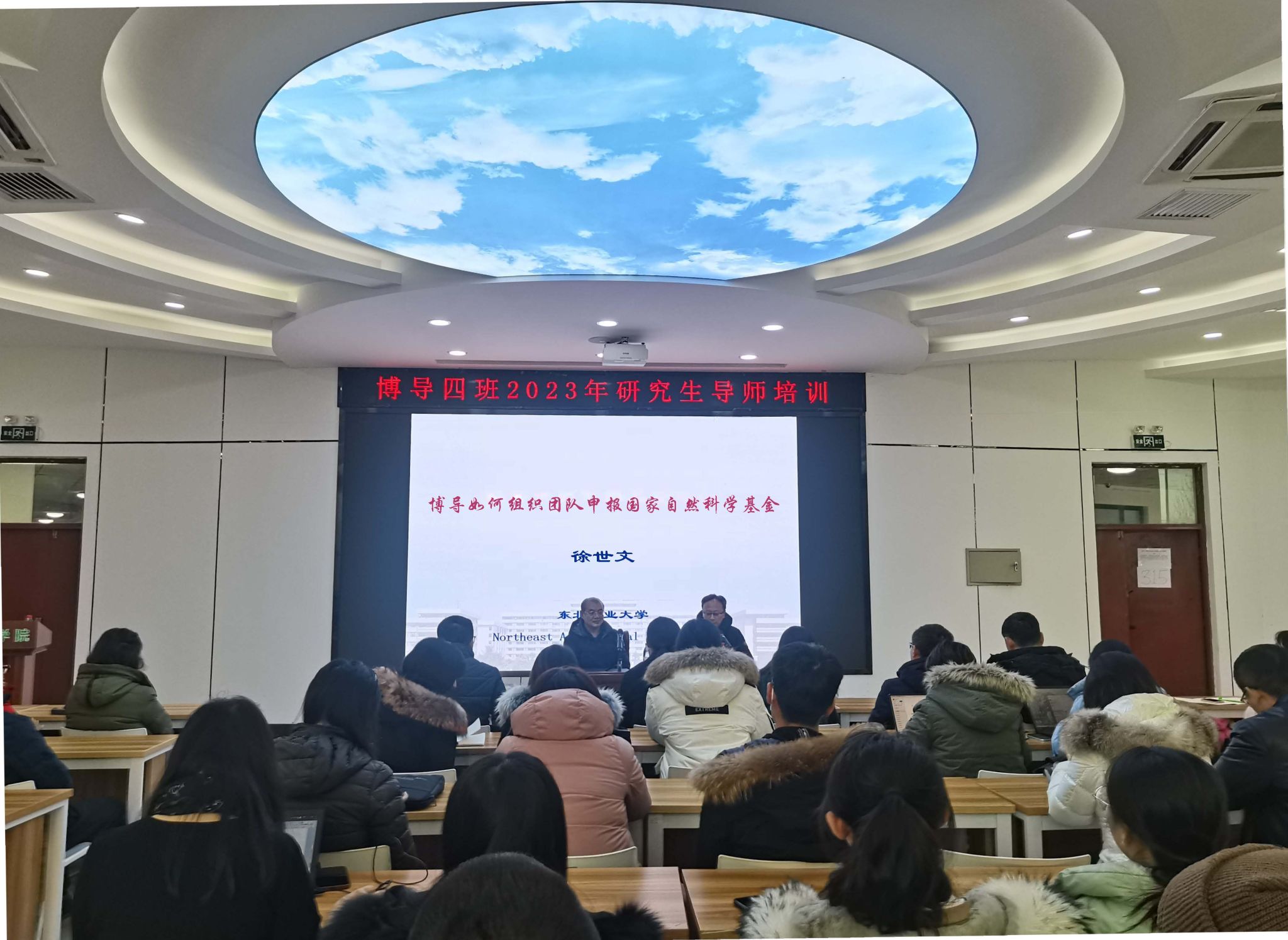 为进一步贯彻落实学校《关于开展“两个队伍”一体化培训暨2023年研究生导师培训工作的通知》有关精神,切实提高研究生导师学术管理能力,11月27日下午,我院牵头并针对由生命科学、食品、文理三个学院的博士生导师组成的博导四班全体人员特点,邀请动医学院徐世文教授以《博导如何组织团队申报国家自然科学基金》为题进行专题培训。培训由我院院长姜毓君主持。