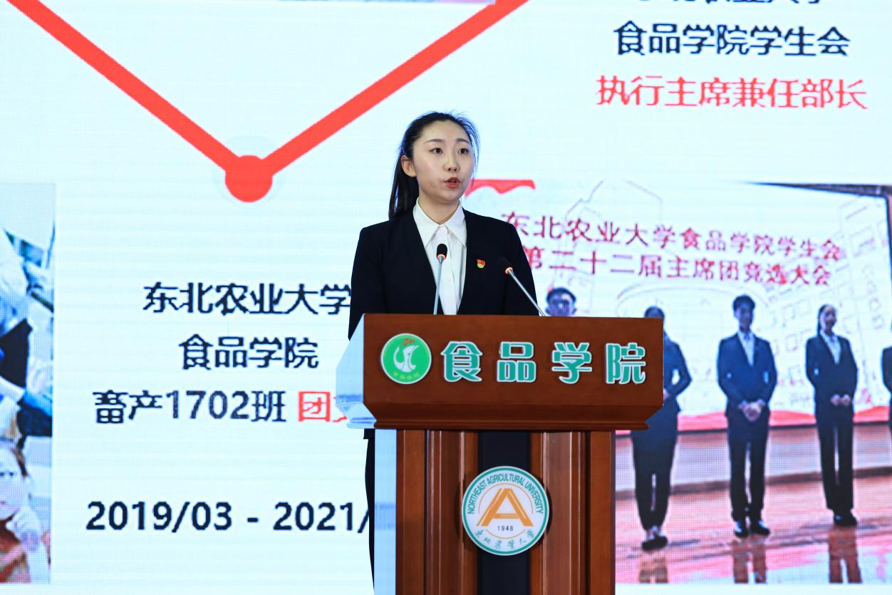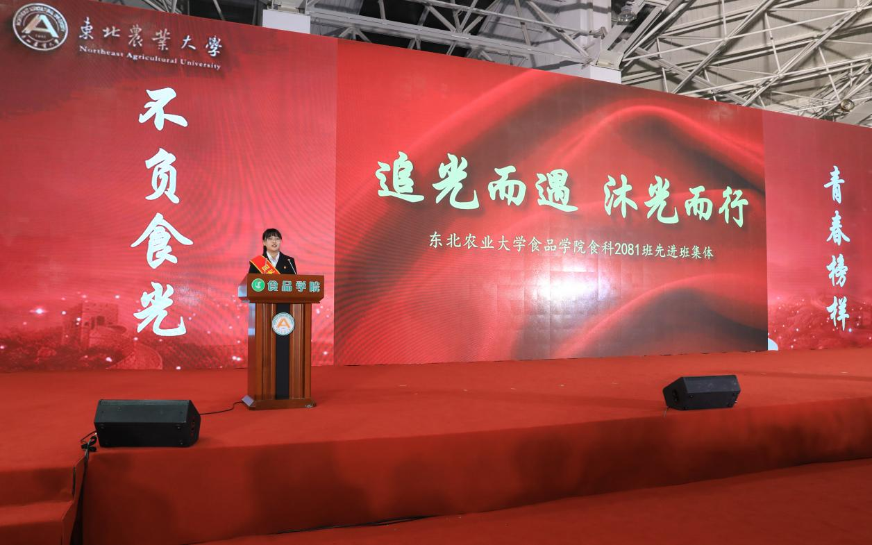 食科2081班李师行代表本科生先进班集体发言,她表示将以爱校荣校为己任,戒骄戒躁、脚踏实地,努力奋斗,心怀家国,心怀天下,做一个有理想、有本领、有担当的东农人。