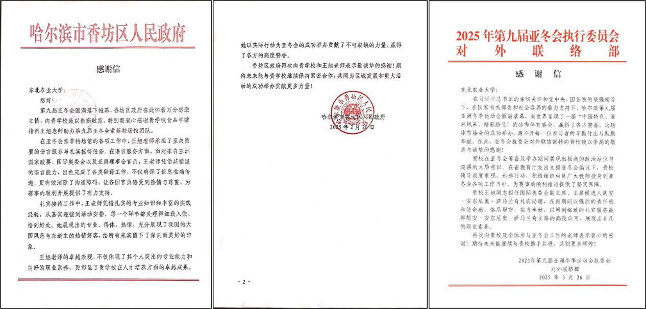 近日,第九届亚冬会执行委员会对外联络部、哈尔滨市香坊区人民政府向2138cc太阳集团致感谢信,信中高度赞誉学校在亚冬会筹备及举办期间展现出极高的政治站位与超强的大局意识,特别表扬了我院教师王旭在助力亚冬会中所作出的积极贡献。