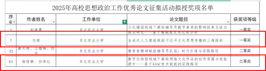 其中,我院辅导员任萌撰写的《生成式人工智能赋能习近平文化思想传播的三维探析》荣获一等奖;我院副处级辅导员杨俊静、经济管理学院正处级辅导员孙珠红撰写的《数字化转型视域下高校网络文化作品的创作突围与效能提升——基于AIGC技术赋能的实践路径》荣获三等奖。