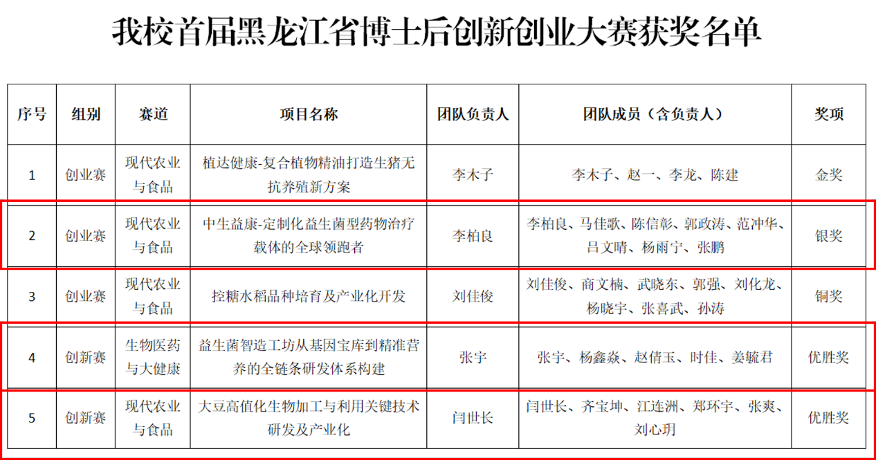 7月30日,黑龙江省人力资源和社会保障厅公布了首届黑龙江省博士后创新创业大赛获奖结果,我院3支参赛团队获奖,其中李柏良为团队负责人的“中生益康-定制化益生菌型药物治疗载体的全球领跑者”项目获得创业组现代农业与食品赛道银奖,张宇为团队负责人的“益生菌智造工坊从基因宝库到精准营养的全链条研发体系构建”项目获得创新赛道生物医药与大健康赛道优胜奖,闫世长为团队负责人的“大豆高值化生物加工与利用关键技术研发及产业化”项目获得创新赛道现代农业与食品赛道优胜奖。