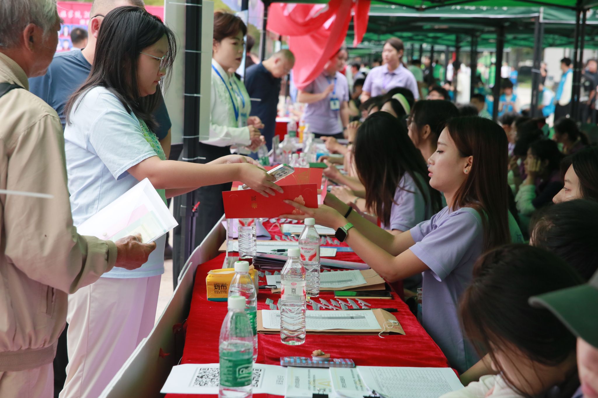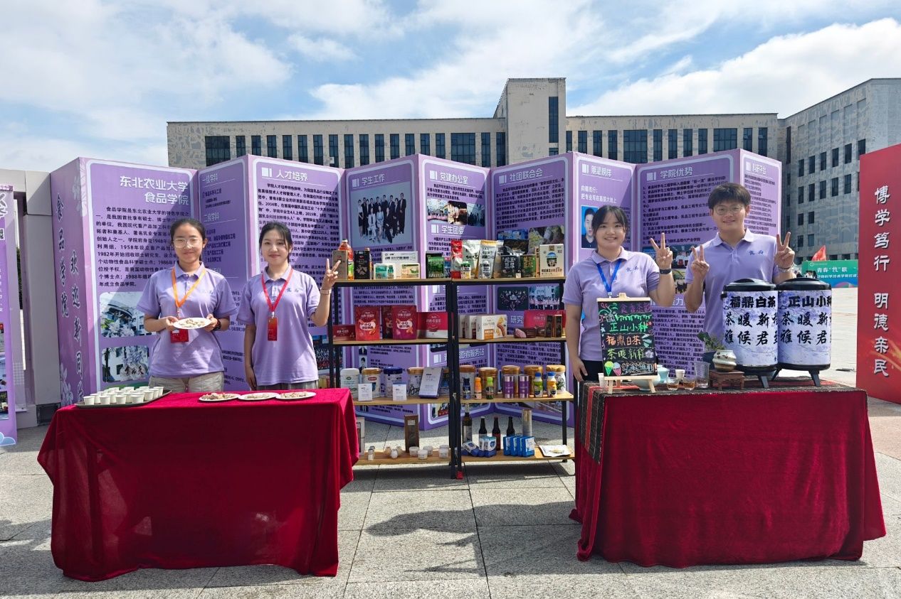 学院将报到现场精心打造成沉浸式“食品文化客厅”,以学科特色“食品紫”为主色调铺陈氛围。步入其中,折叠展板与潮流打卡墙串联起学院沿革、科研平台等核心信息,转角处的“奋斗长廊”则以扎根边疆、领航行业、留校深造三类榜样故事为新生锚定成长坐标。除了视觉浸润,更有温度满满的定制体验,NFC钥匙扣轻触即激活专属电子身份,透卡折射出“食品紫”渐变光影,集卡明信片解锁互动打卡趣味。在食品科技展台前,新生与家长现场品尝实验室出品的红肠、酸奶,以及茶艺社现冲的红茶,“东农味道”在香气氤氲中直抵心田。特别设置的“绿色通道”为家庭经济困难新生备好暖心“加油包”,从生活必需品到学业支持,全方位护航求学路。全程护航的还有志愿者们,他们一对一贴身服务,搬运行李健步护航,以微笑递上首张温暖的“食品家”名片。