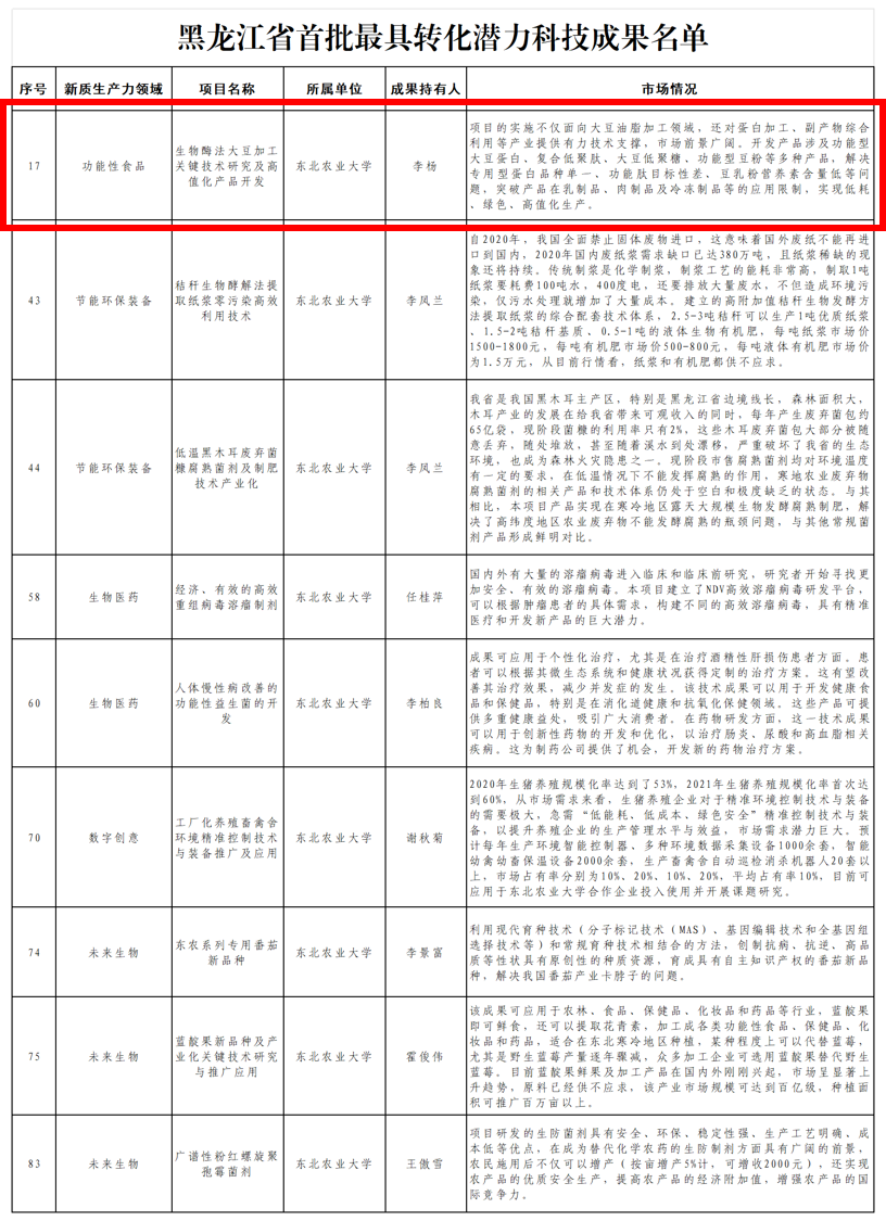 为贯彻落实习近平总书记在龙江视察期间的重要讲话重要指示精神,促进技术、资本、人才等要素融合,提高科技成果落地转化率,2023年10月23日,省科技厅、省教育厅、省工信厅、省国资委、省地方金融监管局联合发布《黑龙江省最具转化潜力科技成果遴选工作通知》,面向省内各高校、科研院所、新型研发机构征集科技成果。我校高度重视并积极组织成果参加此次遴选工作,通过“网上征集、专家推荐”等方式,聚焦我省“4567”现代产业体系,围绕生物经济、新材料、高端装备等产业领域遴选出35项优秀科技成果参加了此次申报。