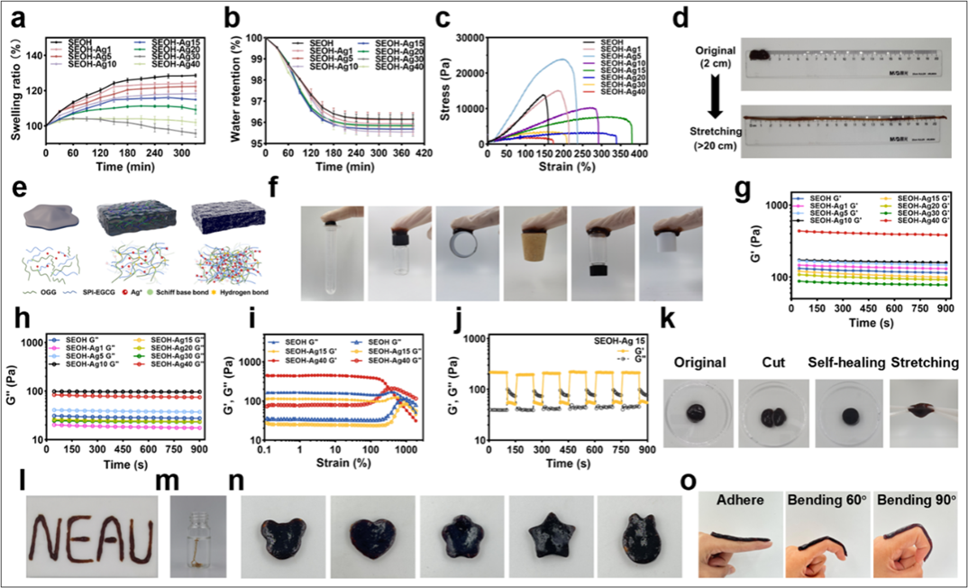 为了突破传统植物蛋白基水凝胶在力学性能和稳定性等方面的局限,本研究深入探索利用动态席夫碱键与金属-配体键相结合的动态化学键交联策略,成功研制出一种新型、环保的高强度大豆蛋白基水凝胶。与传统依赖加热的水凝胶制备方法不同,本研究通过创新的化学反应设计,仅通过简单的搅拌过程,即可促使氧化瓜尔胶(OGG)中的醛基与经表没食子儿茶素没食子酸酯(EGCG)修饰的大豆蛋白中的氨基发生席夫碱反应,直接形成水凝胶。这一方法不仅简化了制备步骤,还赋予了水凝胶独特的自愈合能力。同时,借助引入银离子与EGCG中的儿茶酚基团形成金属-配体键,促进了蛋白质分子间的交联和团聚体的形成,进一步强化了水凝胶的三维网络结构,并实现对水凝胶性能的精细调控。
