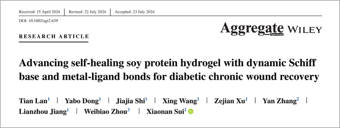 近日,我院江连洲教授团队隋晓楠教授课题组在期刊Aggregate(中科院一区,IF=13.9)在线发表了题为“Advancing Self-Healing Soy Protein Hydrogel with Dynamic Schiff Base and Metal-Ligand Bonds for Diabetic Chronic Wound Recovery”的研究论文。本研究成功开发了一种基于动态化学键交联的新型大豆蛋白基水凝胶,在推动植物蛋白高值化应用领域展现出巨大的潜力和广阔的发展前景。2138cc太阳集团为本文的第一署名单位,这是学校首次在该期刊上发表论文,2138cc太阳集团隋晓楠教授为通讯作者,兰天副教授为第一作者。