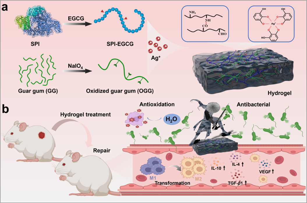 (a)大豆蛋白基水凝胶通过动态席夫碱键和金属-配体键形成示意图,(b)大豆蛋白基水凝胶促进创面愈合示意图