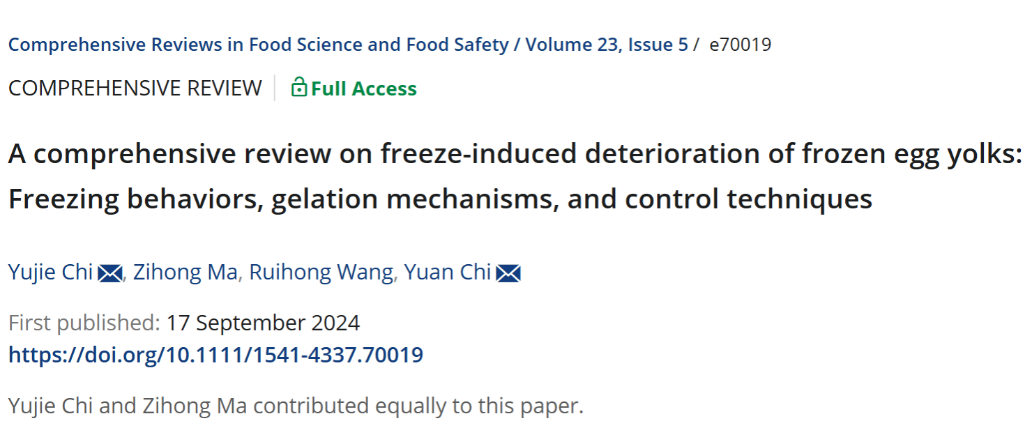 近日,我院蛋品加工技术及科学团队在国际权威学术期刊Comprehensive Reviews in Food Science and Food Safety上(中科院1区期刊,最新影响因子12.0)发表题为“A comprehensive review on freeze-induced deterioration of frozen egg yolks: Freezing behaviors, gelation mechanisms, and control techniques”的综述型论文(https://doi.org/10.1111/1541-4337.70019)。我院迟玉杰教授、工程学院迟媛教授为通讯作者,我院21级博士研究生马子泓为共同第一作者。该研究受国家自然科学基金项目-冰蛋黄凝胶化形成和发展机制及关键因子解析的资助。