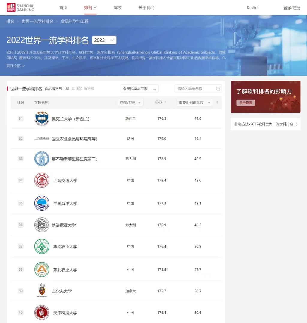 日前,高等教育评价专业机构软科正式发布2022年“软科世界一流学科排名”,我院食品科学与工程学科在世界知名高校中排名第38位。