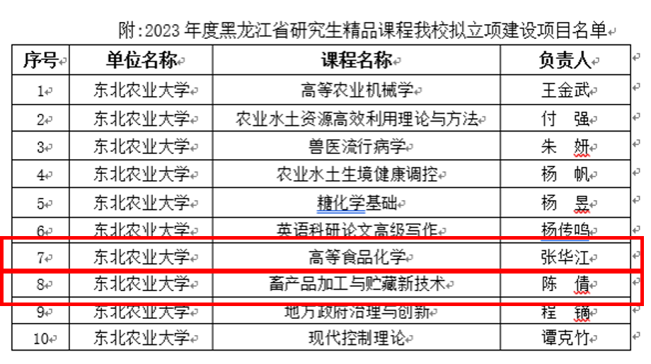 近日,黑龙江省教育厅公布了2023年度黑龙江省研究生精品课程建设项目评审结果,我院推荐的张华江教授的《高等食品化学》和陈倩教授的《畜产品加工与贮藏新技术》2门研究生精品课程获批立项。
