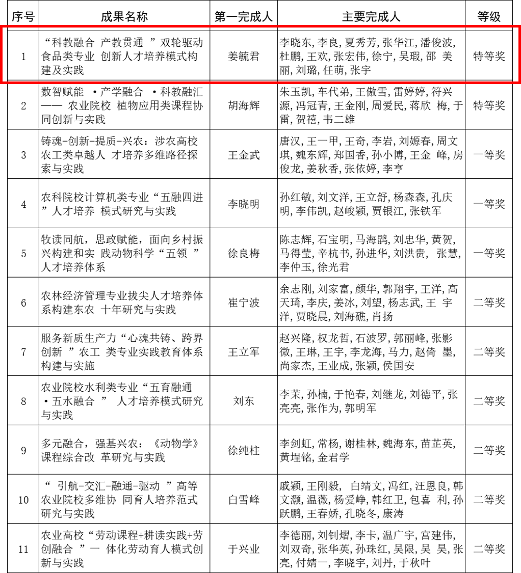 近日,黑龙江省教育厅发布《关于2024年黑龙江省高等教育(本科、研究生)和职业教育教学成果奖拟授奖成果的公示》,我院姜毓君教授为第一完成人的《“科教融合 产教贯通”双轮驱动食品类专业 创新人才培养模式构建及实践》获得特等奖,全校共有特等奖2项。