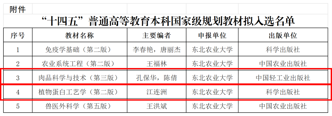 孔保华、陈倩主编的《肉品科学与技术(第三版)》和江连洲主编的《植物蛋白工艺学(第二版)》入选“十四五”普通高等教育本科国家级规划教材。