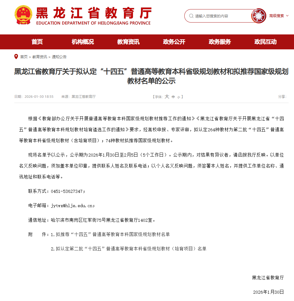 近日,教育部高等教育司和黑龙江省教育厅公示了“十四五”普通高等教育本科国家级规划教材入选名单和黑龙江省拟认定“十四五”普通高等教育本科省级规划和拟推荐国家级规划教材名单,我院10部教材成功获认定与推荐。