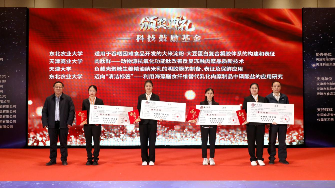 “天食杯”第五届食品研究与开发创新创意大赛以“产学研聚力向前 激发新质生产力”为主题,紧密围绕深化企校产学研协同创新,立足新质生产力发展需求,搭建企校深度融合的科技合作平台,进一步推动企校在项目孵化、技术突破、人才培养等方面的深度合作,助力食品产业高质量发展。本届大赛收到全国30个省、市、自治区,189个参赛单位的1226件参赛作品。决赛经过现场展示及专家评委会评审,评选出最终获奖作品。其中,孔保华、刘昊天指导作品“‘干嘛 D’—一款甘油二酯牛肉肠”荣获产品创新类竞赛一等奖,张现龙、杨鑫焱指导作品“就‘要’美味—中草药活菌冰淇淋”荣获产品创新类竞赛三等奖,曹传爱、吕懿超指导作品“迈向‘清洁标签’—利用海藻膳食纤维替代乳化肉糜制品中磷酸盐的应用研究”、郭增旺指导作品“适用于吞咽困难食品开发的大米淀粉—大豆蛋白复合凝胶体系的构建和表征”荣获科技鼓励基金。