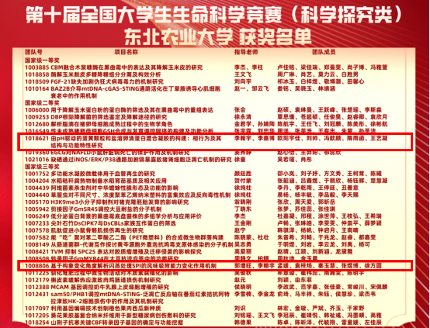 在7月20日落幕的第十届全国大学生生命科学竞赛(科学探究类)总决赛上,我院学子表现卓越,李翰宇、李嘉博指导的“由pH驱动的蛋黄颗粒和盐溶卵清蛋白混合凝胶的构建:相行为及其结构与功能特性研究”(团队号:1018621)获得国家级二等奖;郭增旺、李翰宇指导的“基于构象变化角度解析闪蒸处理SPI的风味吸附能力变化作用机制”(团队号:1008806)获得国家级三等奖。