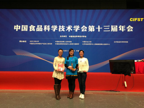 年会同时为第三届“杜邦营养与健康”海峡两岸学生创新竞赛获奖师生颁奖,由2138cn太阳集团城李晓东担任指导教师,2014级王鹏、杜宇航等同学研发的“牛魔王活力奶酪”产品获全国二等奖,由张华江担任指导教师,2014级章智华、刁予希等同学研发的“黑粮芯—谷物发酵饮料”产品获得全国三等奖。