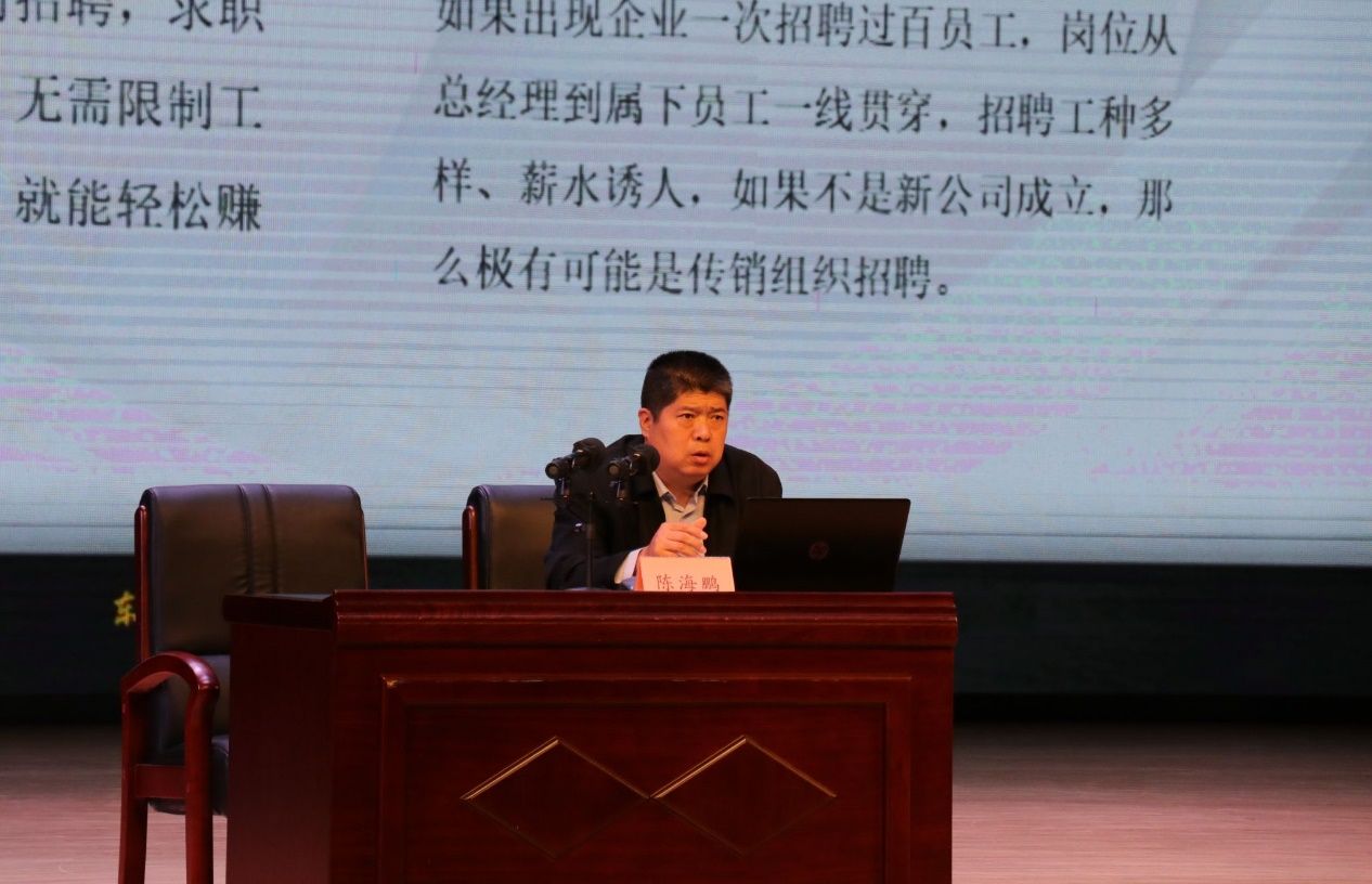 按照学校《关于开展2024年春季开学季“三防”进校园及校园安全法制宣传警示教育活动的通知》要求,切实加强在校学生防范电信网络诈骗、拐卖和性侵等违法行为的意识和能力,遏制校园内此类犯罪案件发生,营造安全健康的校园环境,4月9日,我院在音乐厅举办“三防进校园”2024年校园安全讲座,邀请保卫处治安科科长陈海鹏进行校园安全宣讲,我院全体辅导员及1200余名学生参加讲座。会议由我院党委副书记钱芳主持。
