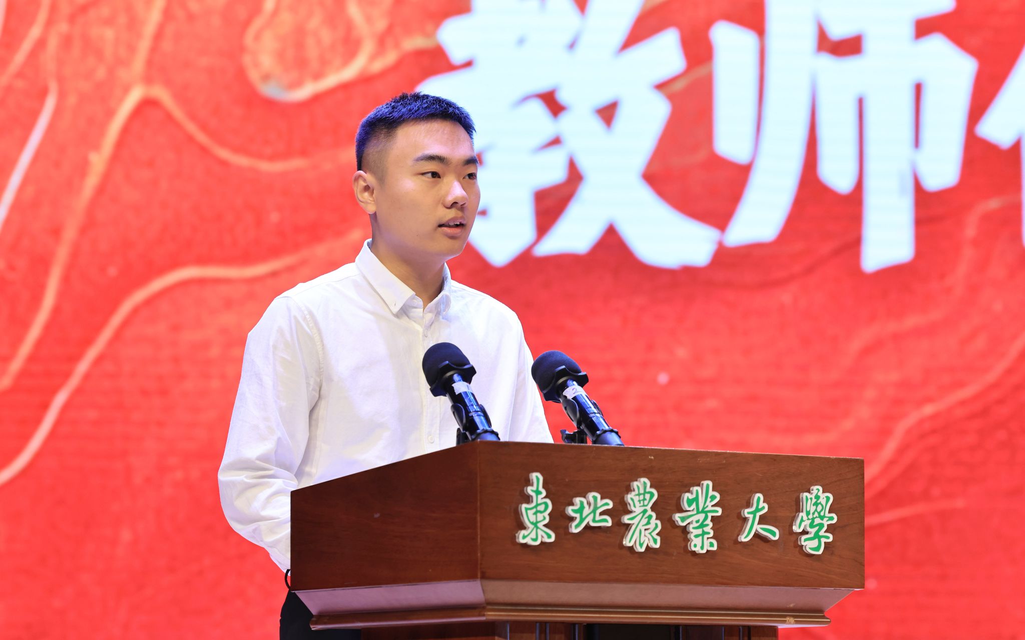 研究生新生辅导员吕懿超带领全体新生庄严宣誓。“我将秉承‘博学笃行、明德亲民’的东农校训,践行‘高标准、新机制、争一流、创品牌’的学院方针,遵守校规校纪、恪守学术道德、深耕食品沃土、勇攀科学高峰,为弘扬东农精神、赓续食品荣光贡献青春力量!”