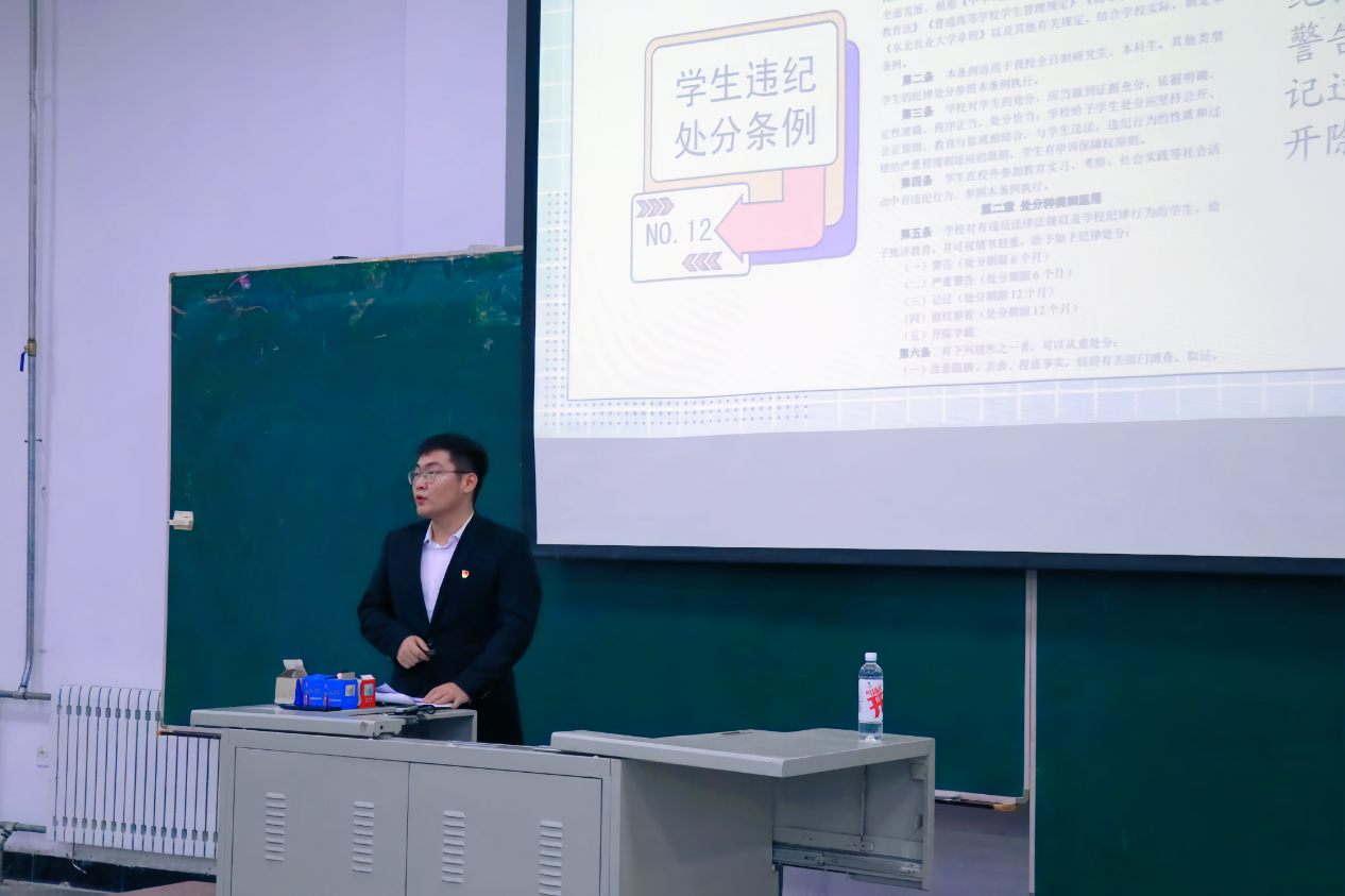 2024级新生辅导员李嘉博讲解了学生违纪处分条例和学生违纪解除暂行办法的相关内容,针对学业预警、考试作弊处分等方面进行了强调,通过相关事例警示同学们守住底线,强化纪律观念,自觉养成良好行为习惯,共同建设良好学风。