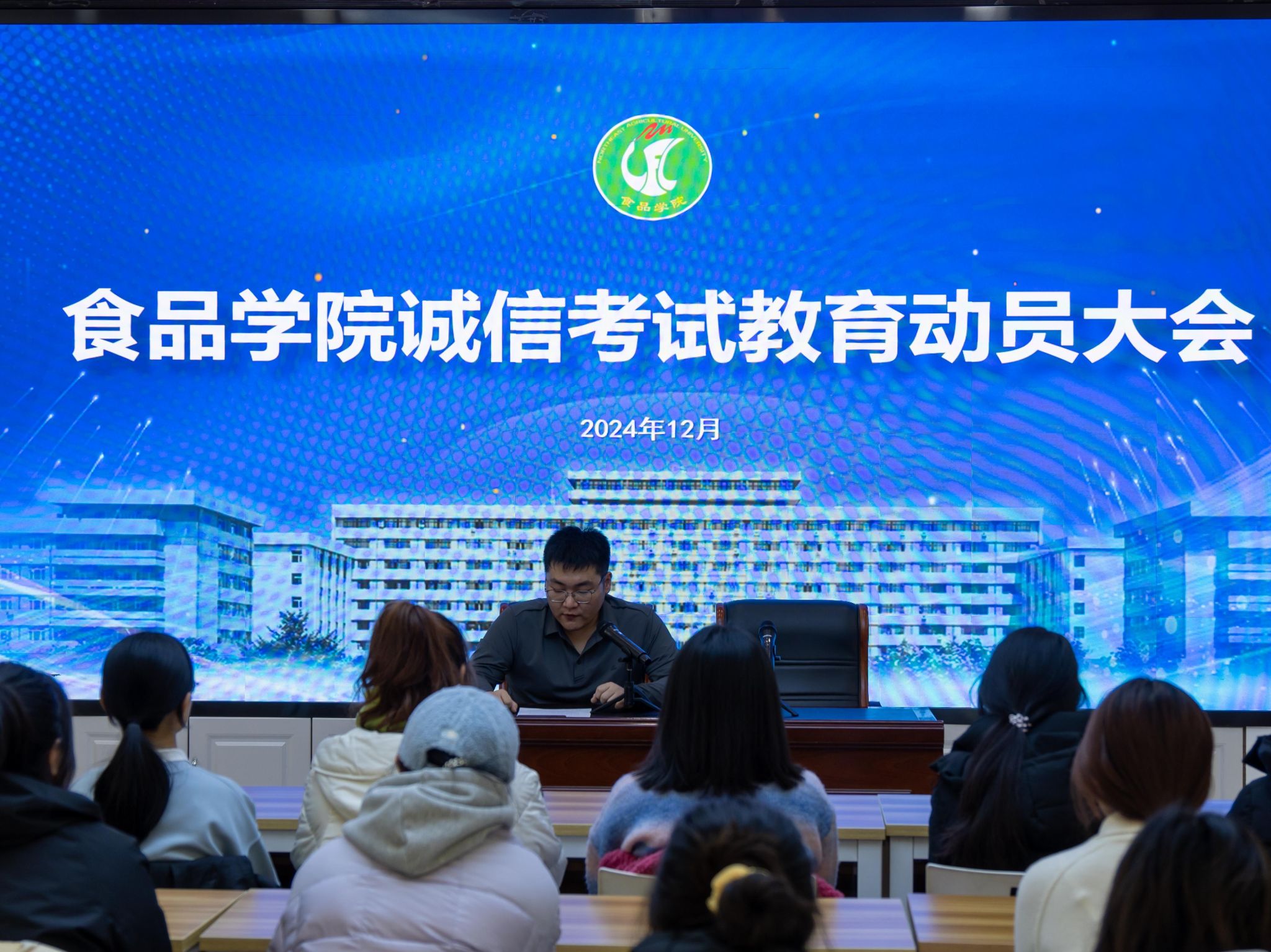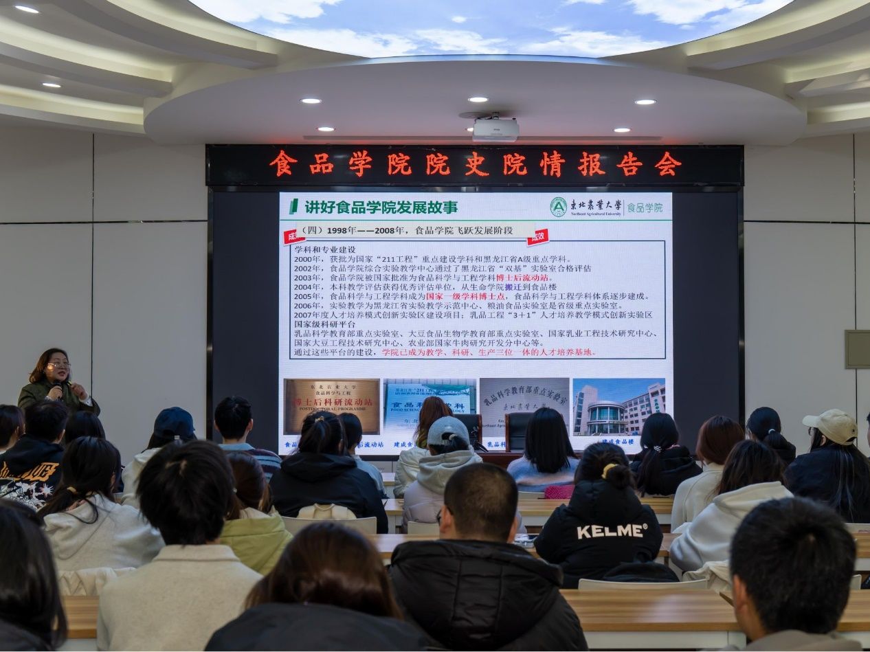 为深入贯彻落实立德树人根本任务,提升学院思想政治教育工作水平,引导新生更加全面地了解学校、学院发展历史,增强学生身份认同感,12月6日,我院在食品楼315报告厅开展院史院情教育报告会。辅导员李嘉博、冯可馨及2024级全体学生干部参加会议。报告会由学院党委副书记钱芳主持。