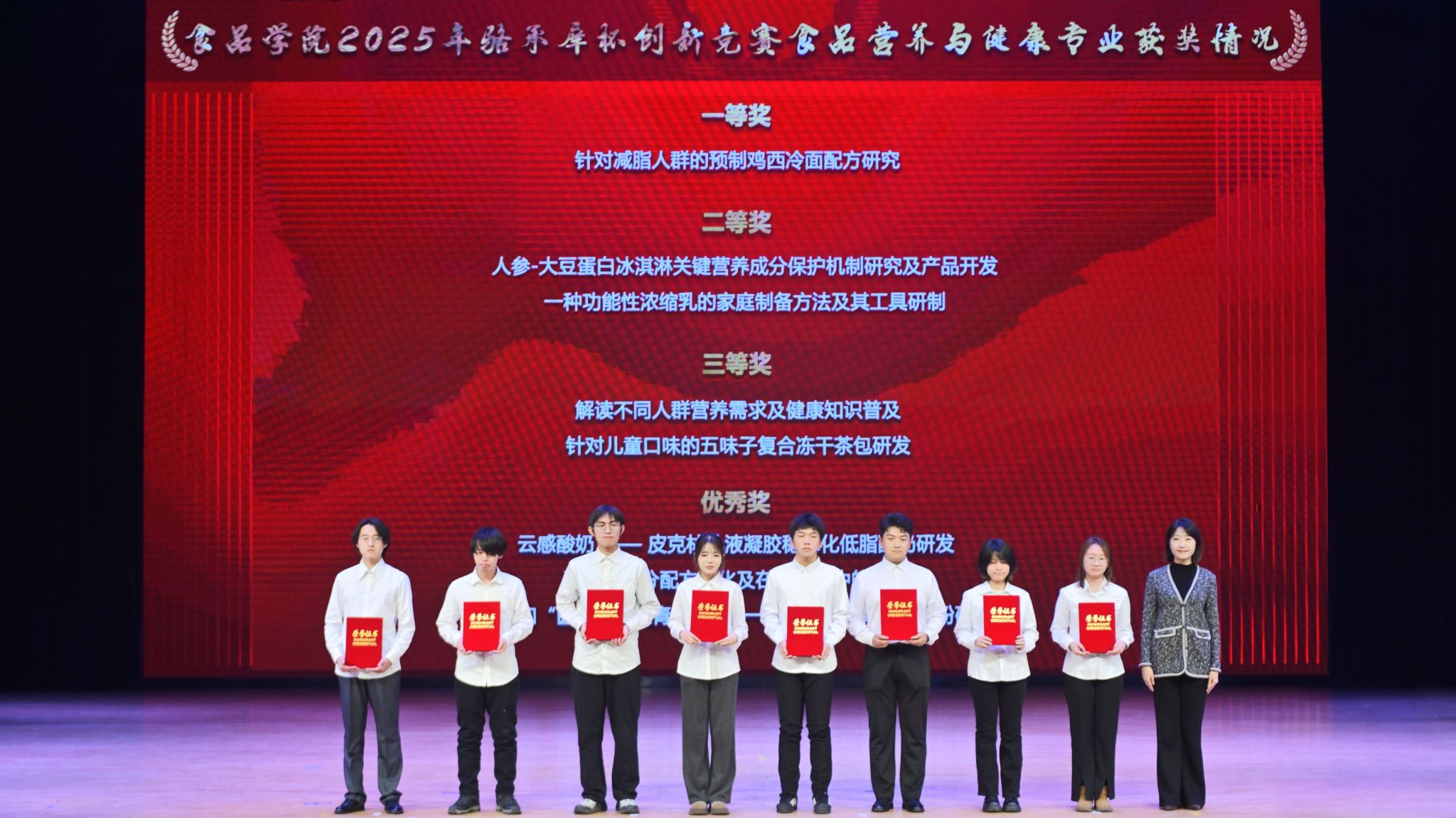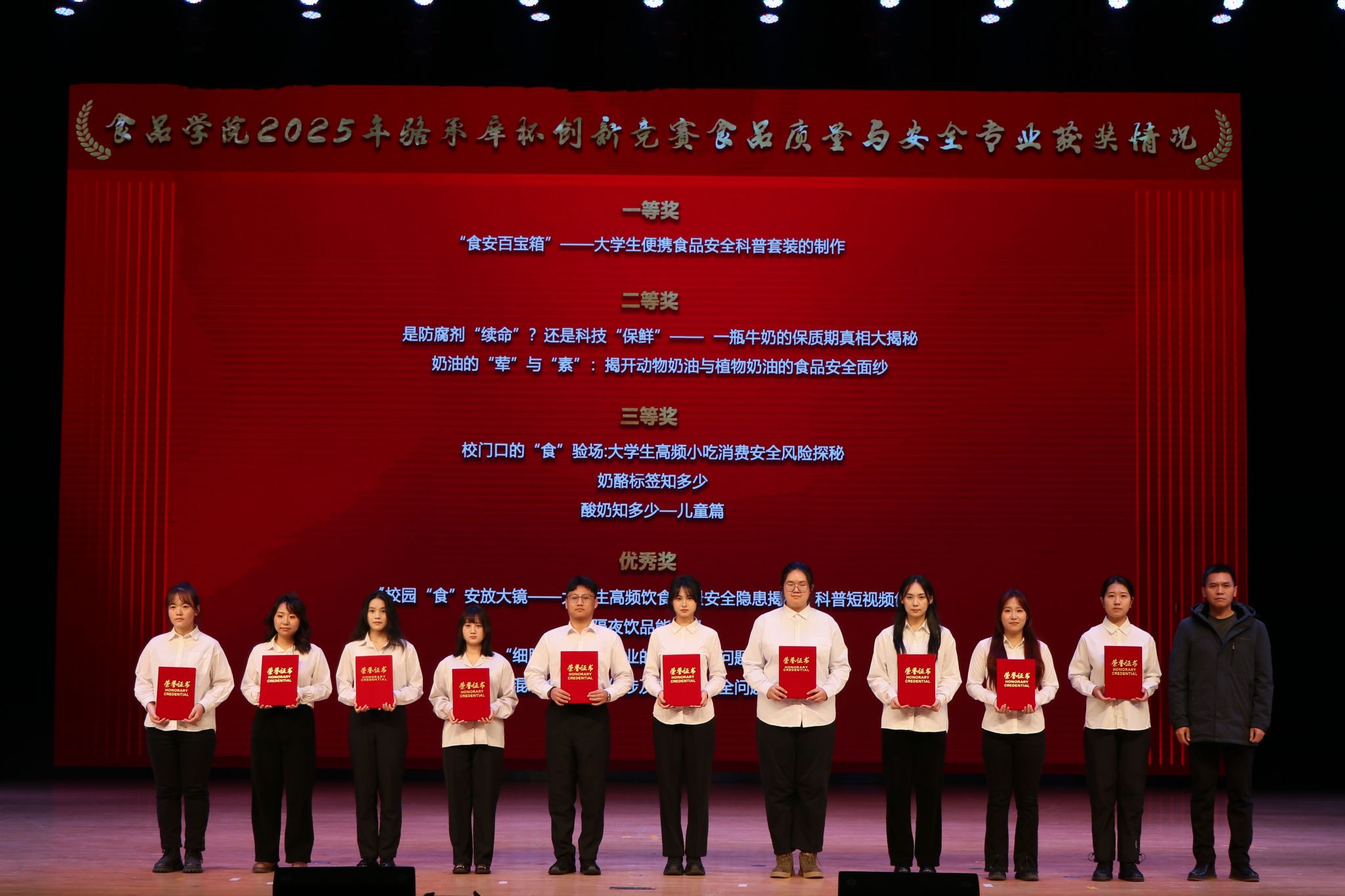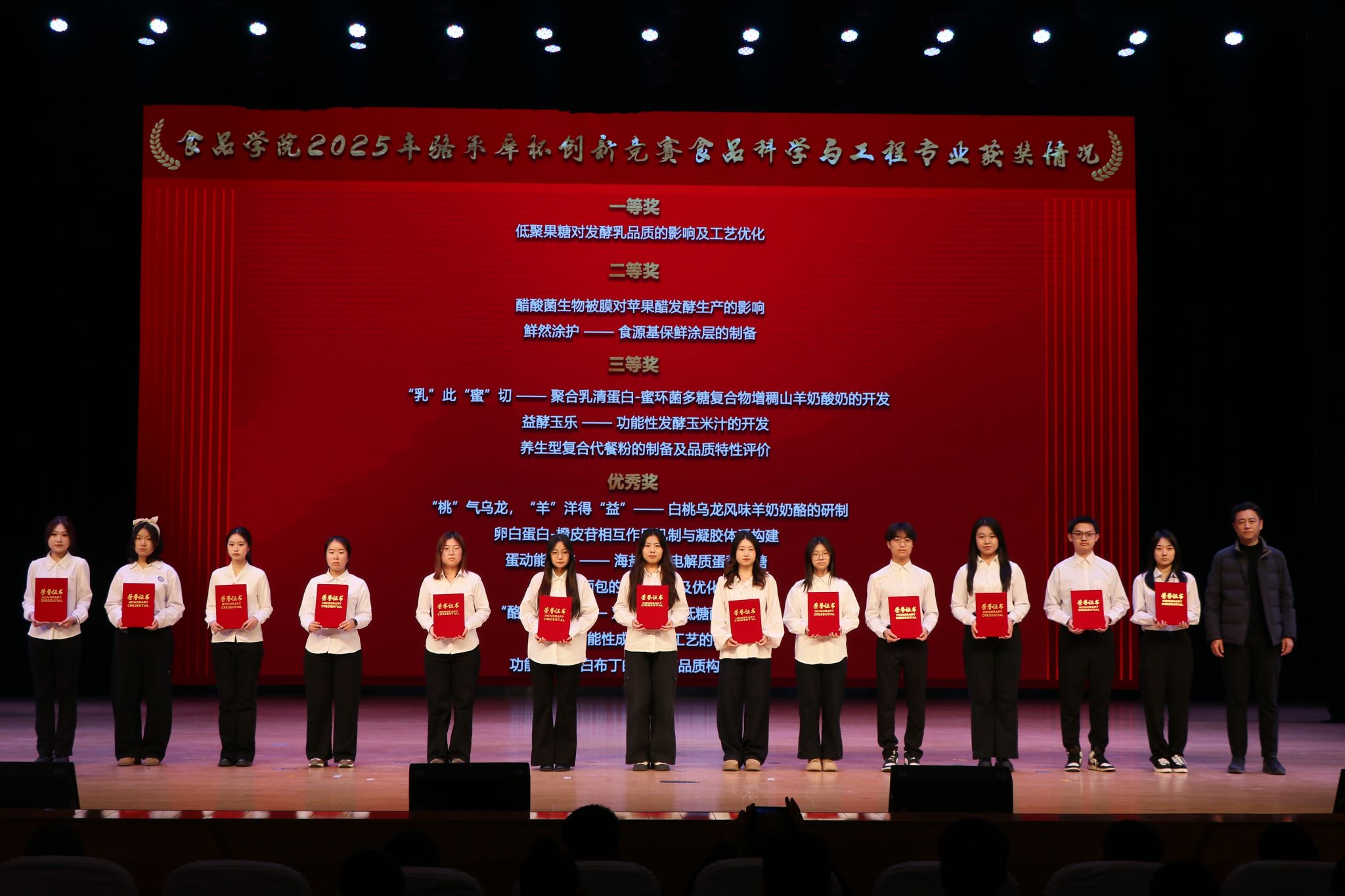 表彰环节中,与会领导依次为获奖团队及优秀指导教师颁奖。获奖学生代表上台分享科创实践感悟,传递食品学子“敢闯敢试、追求卓越”的精神风貌。