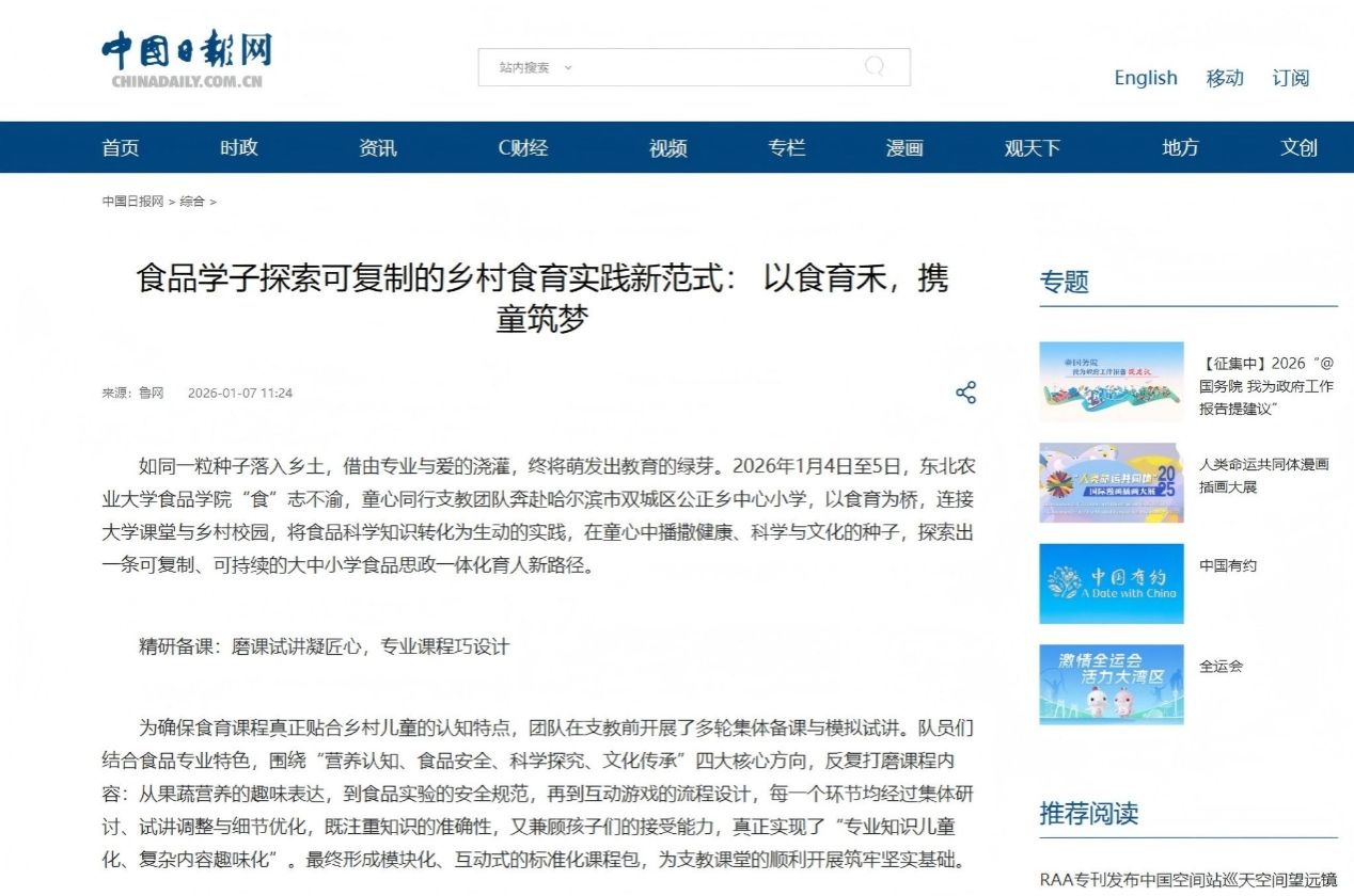 特色育人,润物无声。寒假期间,学院精心策划12项线上特色活动,将“文化传承+心理成长+专业实践”有机融合,共计参与800余人次。同时,学院2025级本科新生全员参与87支社会实践团队,围绕党史学习、公益志愿、乡村振兴等主题深入基层一线,推动专业知识与社会实践双向赋能,相关成果获中国日报网等主流媒体关注报道,充分展现食品学子的青春风采和责任担当。