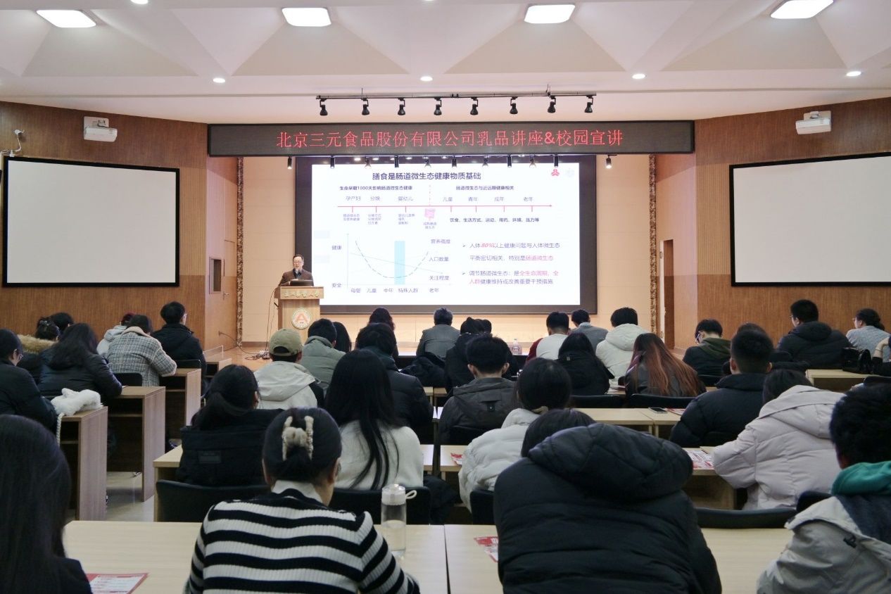 为进一步贯彻落实党中央、国务院关于促进高质量充分就业的决策部署,助力学生做好职业规划,找准突破口实现优质就业,12月11日,北京三元食品股份有限公司到访我院,在音乐厅109会议室进行校园招聘宣讲会,三元食品副总经理、首席科学家陈历俊,总经理助理、CHO山良圣,人力资源部经理杨世言,我院党委副书记钱芳、辅导员吕懿超、梁爽、李嘉博及120余名学生参加本次活动。会议由钱芳主持。