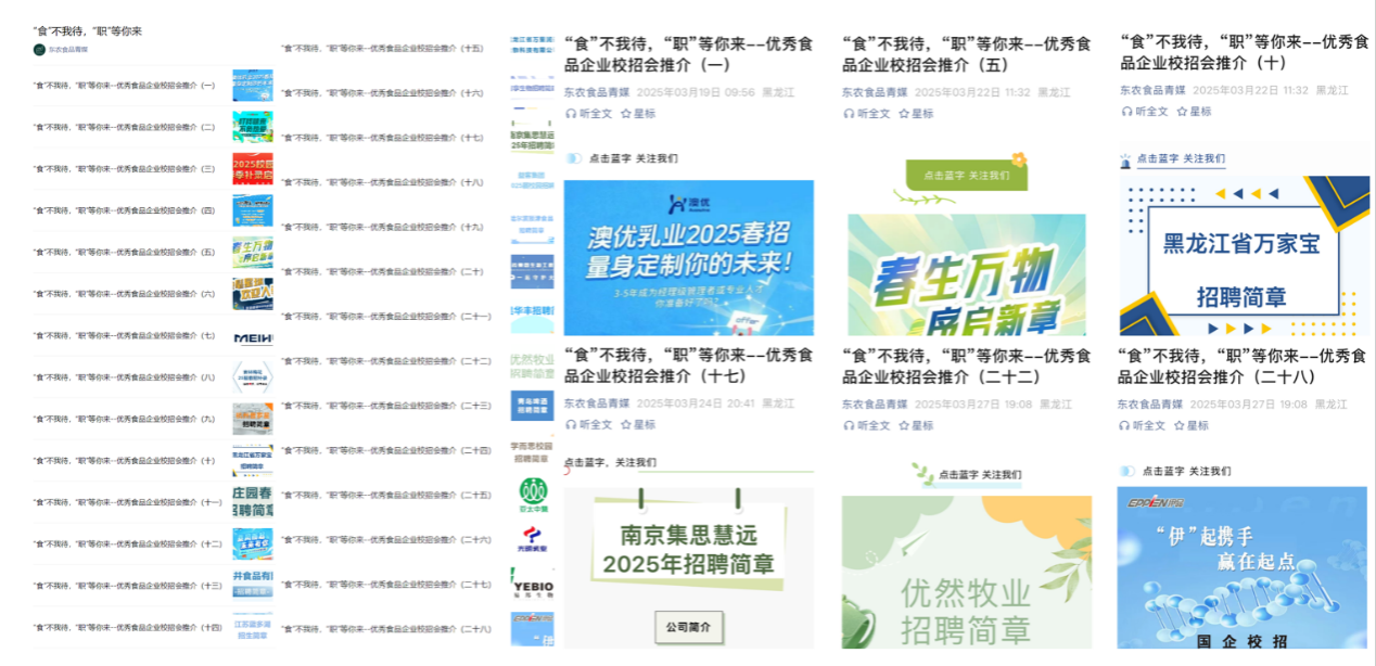 学院依托新媒体矩阵,打造“线上+线下”立体化就业信息平台,提升岗位供需对接效率。学院微信公众号设立“就业指南”专栏,本月共发布28家食品企业招聘信息,涵盖研发、检测、生产等岗位,日均浏览量超千次。安排毕业班辅导员分类对接优质企业,推行动态追踪机制,实时更新岗位需求,确保毕业生第一时间获取招聘资讯。